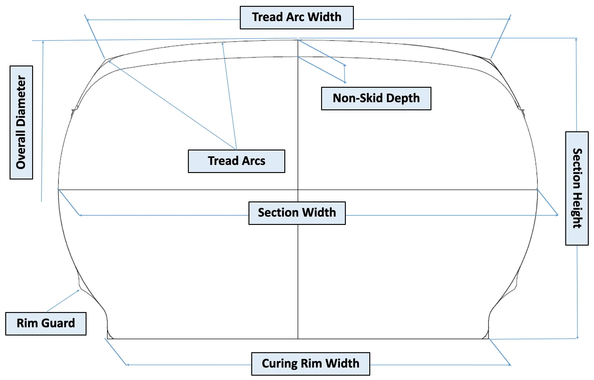 Tread Arc (or Radius) – the outer surface of the tread profile is made up of circular arcs or radii that can be flatter or rounder, depending on the type of the tire and its intended performance. Near the center of the tread, the radii are typically very flat, while in the shoulder they are much smaller diameters (and more round).